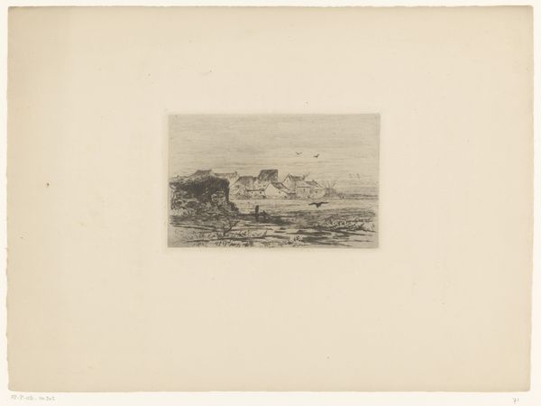 Max Liebermann created this etching titled "Landschap met hek en molen," or "Landscape with Fence and Mill," using delicate lines and a nuanced tonal range. The composition balances foreground, middle ground, and background, leading the eye from the rough texture of the fence to the tranquil landscape. Liebermann uses the etching technique to create a sense of depth, despite its small size. Notice how the texture is achieved through layered lines, giving the landscape a hazy, dreamlike quality. The subtle variations in tone suggest a structural interplay between light and shadow, creating a unified visual experience. This work invites us to consider the aesthetic potential of printmaking and the artist’s ability to convey atmosphere and depth with minimal means. It reflects an interest in capturing a fleeting moment, characteristic of much late 19th-century art.