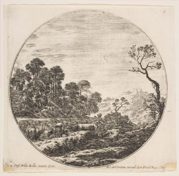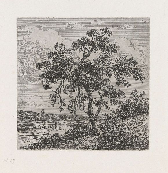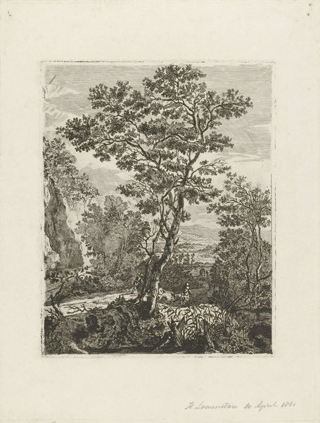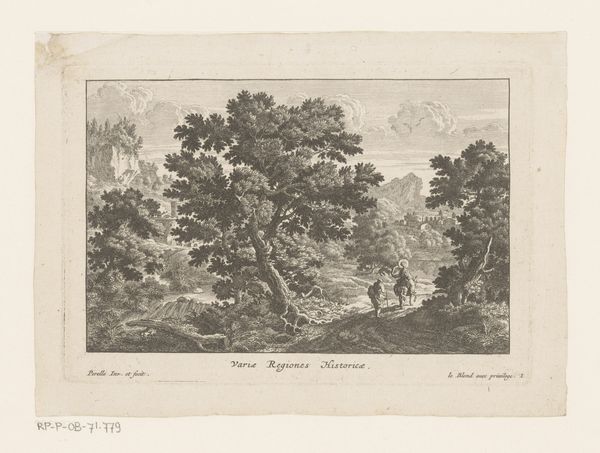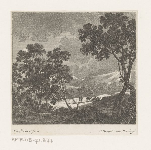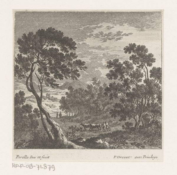 Editor: This is "Landschap met bomen," or "Landscape with Trees," an engraving by Nicolas Perelle, dating from between 1673 and 1695. The scene feels serene, even melancholic, with the delicate lines creating a textured world of leaves and clouds. How do you interpret this work? Curator: Immediately, I’m drawn to consider what constitutes “landscape” at this moment in history, and who gets to participate in its representation. Consider how often these idealized landscapes actively erase the laboring bodies – especially women and people of color – whose exploitation makes such idyllic scenes possible. How does Perelle's work, specifically as a print available for wider distribution, shape ideas about land ownership and access during an era of burgeoning colonialism? Editor: That's a perspective I hadn't considered! So, are you suggesting the seeming innocence of this landscape might conceal a more complex narrative of power and exclusion? Curator: Precisely! This image exists within a context of land enclosure and expanding French colonial ambitions. Look closely at the ownership signature and consider who can and cannot afford such imagery. What function might such an image serve? Editor: Perhaps it reinforces a sense of dominion over nature and, by extension, over those who are perceived as being closer to it? Curator: Exactly! And let’s also not ignore the artistic conventions. How does the artist deploy the existing landscape genre, and to what end? Editor: I see how examining art through the lens of history and social structures can reveal hidden dimensions. Curator: Indeed! It encourages us to question whose stories are being told and, crucially, whose are being left out. Art doesn't exist in a vacuum, does it?