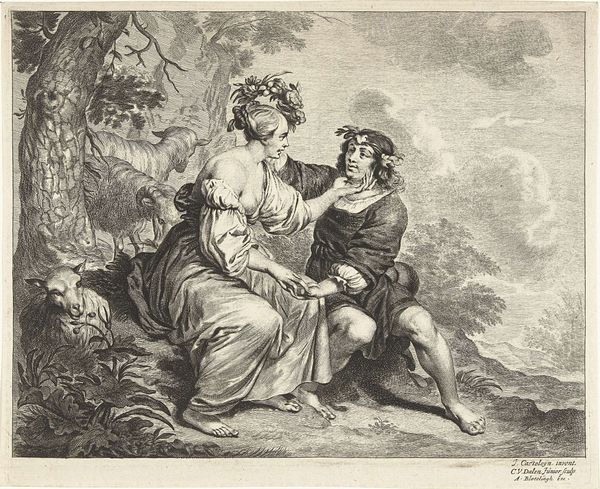 Editor: Here we have Angelica Kauffmann's 1782 oil painting, "Allegory of Poetry and Music." There's such a serene and graceful feeling about this composition, like a perfect harmony. How do you interpret this work through its formal qualities? Curator: Indeed. Note how Kauffmann uses the circular format – a tondo – to frame the figures. The gentle curves are echoed in the figures' poses and drapery, reinforcing that feeling of harmony you mentioned. The muted, almost pastel-like palette further contributes to the overall tranquility. Observe how the artist aligns the central figures, positioning Poetry slightly ahead of Music. What might this juxtaposition signify in relation to the allegory? Editor: Well, it's interesting because Poetry is holding a stylus and tablet, seemingly poised to create. And Music, with her lyre, is looking to Poetry for inspiration. Is the visual imbalance an allusion to an artistic inspiration? Curator: Precisely. There is a reliance between these figures, these two classical muses of art. Kauffmann creates that very close proximity, an undeniable association. It underscores the allegorical content, while her neoclassical training is evident in the precise draftsmanship and balanced composition, drawing the viewer's eye deliberately. Did you observe that structural order? Editor: Now that you point it out, it does seem incredibly balanced and refined. It really makes you consider how deliberate Kauffmann was in every choice. It is interesting that we can study artworks and focus our attention on the shapes and arrangement of items within them. I didn’t realize we could get so much from this viewpoint! Curator: By closely analyzing the pictorial elements, one can begin to comprehend a more comprehensive meaning of its artistic merit.