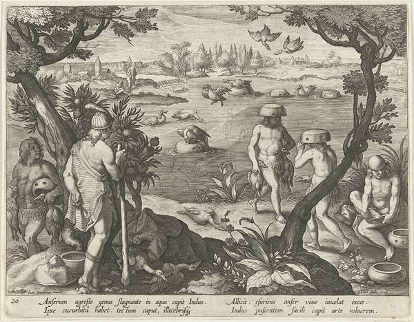 Jan Collaert II created this engraving, "Draken doden in Egypte," at the turn of the 17th century. The eye is drawn to the meticulous detail of the scales on the dragons' bodies, juxtaposed against the muscular forms of the men who are attacking them. This interplay of textures creates a dynamic visual tension throughout the scene. The composition is structured around a central clearing where the dragon slaying takes place, flanked by denser foliage and distant landscapes. This arrangement organizes the chaos of the depicted event, providing a sense of depth and perspective. Engravings like this one, with their clear lines and structured compositions, reflect the early modern interest in order and understanding. The image’s formal qualities, like the contrast between foreground action and background landscape, support a narrative that engages with contemporary philosophical concerns about humanity's relationship with the natural world. The engraving invites us to interpret it, making the work an evolving cultural artifact.