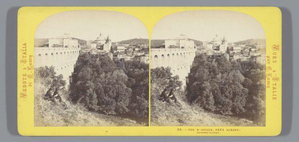 Curator: Ah, yes, "Gezicht op de vesting Hohensalzburg," or "View of the Hohensalzburg Fortress," captured in 1868 by Charles Gaudin. It's a photographic stereoscopic card. There’s something haunting, almost dreamlike, about the light. What do you see? Editor: The fortress dominates the scene; it’s so imposing on top of that hill. It reminds me of something out of a fairytale… or maybe a nightmare, actually. So what kind of story is this image trying to tell? Curator: I love that duality! It *is* both. It whispers of Romanticism’s obsession with the sublime – the terrifying yet beautiful power of nature and history. The very process of photography, still relatively new then, attempted to capture that truth but perhaps even amplified it. Notice the solitary figure on the path, almost overwhelmed by the scale of the fortress? It hints at man’s insignificance against the weight of time and architecture. Isn't it also romantic that viewers would see the photograph in stereoscope giving it 3D life? How wild is that! Editor: It is cool. So you're saying the slightly ominous feeling I'm getting is intentional? The artist *wanted* that unsettling feeling? Curator: Perhaps "intention" isn’t quite the right word. Gaudin was channeling something. Early photography could capture light in very soft, diffused ways, adding to its dreamlike effect. Now what do *you* think is this dream's message? Editor: Well, if it's not just about historical record and actually making a statement… perhaps it is about acknowledging something we are often prone to forget, which is humanity's place within the grand scheme of history and nature. I will look at photos differently from now on. Curator: Yes! Precisely. This image remains poignant – not just as a historical document, but as a space to explore our own feelings and experiences reflected in light and stone.
