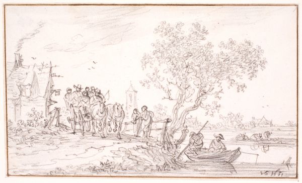Curator: This is a pen and ink drawing by Agostino Tassi titled "Group of Figures by a River." While undated, it showcases Tassi’s talent for landscape and figure drawing. What are your immediate thoughts? Editor: It’s beautifully chaotic, like a summer afternoon distilled into nervous energy. I see a stage with multiple acts playing out. The artist captured the buzz without getting bogged down in detail. Curator: The drawing highlights the pastoral themes prevalent during Tassi's time. You see these gatherings by the water. They serve almost as vignettes of daily life. He did work on landscapes later in his career; you almost see a story in each group. Editor: "Vignettes" is the perfect word! The artist almost dares you to stitch them together, which maybe creates a bigger tale. I’m thinking about the ink. You can almost feel how wet and fluid it was. Look at how much motion is expressed. It’s gorgeous, and how they interact—everyone has some mission. Curator: We have very different groups present in his works; people are loading or unloading goods, other figures bathe, another watches over livestock—possibly sheep—the combination would hint at an active rural economy, maybe some pastoral, leisure activity, at different levels of society represented here. Editor: It also makes me consider light and shadow. Look at how the white of the paper shines, illuminating the shapes and the whole scene. The tree acts almost like a pillar between a very detailed left side of the composition versus one that trails off as the eye wanders. Curator: And Tassi may have understood his audience well—such works allowed patrons to reflect on idealised views of countryside life that became really popular amongst wealthy elites throughout Europe at that time. Editor: It is really beautiful to consider Tassi taking simple raw materials, paper, ink, a pen, and giving us something so expansive and captivating. It reminds you how potent it is to witness and translate a slice of daily existence into art. Curator: I find this drawing a testament to the enduring appeal of seeing daily life in history. Tassi lets us do just that through line and form. Editor: Exactly. It is an entire world contained in a sketch.