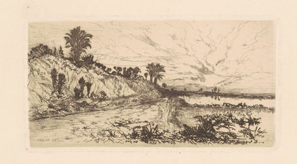 Ellen Day Hale created this etching, "Mission San Diego," sometime in the late 19th or early 20th century. The image depicts the historic Spanish mission amidst a landscape marked by both the exotic presence of palm trees and the humble signs of rural settlement, such as the wooden fence in the foreground. Hale, an American Impressionist, often explored themes related to women and modern life, but in this work, she turns her attention to the visual rhetoric of the American West. The mission, a symbol of Spanish colonial presence, stands as a historical artifact, a testament to the cultural transformations of the region. Hale's choice of subject may reflect the era's fascination with the picturesque and its complex negotiation of westward expansion and its impact on indigenous populations. To truly understand this image, we need to research the social and cultural contexts of Hale’s time, looking into travelogues, historical society records, and the visual culture of the American West. Such investigations reveal the complex layers of history and representation embedded in this seemingly simple etching.