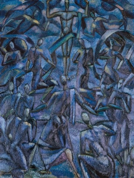 Editor: Here we have Albert Bloch’s “Lied I,” an oil painting from 1914. There's such a dramatic use of color and the figures seem caught in a tumultuous landscape. It’s quite evocative. What do you see when you look at this piece? Curator: I see a confluence of Expressionist concerns manifesting materially. Bloch's thick application of oil paint and vibrant, almost jarring, color choices aren’t just aesthetic; they reflect the anxieties and societal upheavals bubbling under the surface of pre-war Europe. Look at how the bodies are rendered, seemingly manufactured from color; the labor is visible. Editor: Manufactured from color, I like that! I guess the material process mirrors some kind of social production? Curator: Exactly! And think about the title, "Lied," which means song in German. Song is created with great skill, and the visual discord is intentional, speaking to a disruption in the harmonious "song" of society, reflected in both the materiality and subject. Where do you think Bloch got the materials to make his painting? Editor: Hmm, well, he would have had to purchase them, so... how does consumerism figure into it? Curator: Precisely! He is an agent embedded in commercial distribution networks, using the labor of others. That's not incidental here; he is an artist critiquing modernity, through his interaction with commodity and visible production, while using the formal techniques he has honed. Editor: That makes so much sense. I hadn't considered the relationship between materials, production, and the overall message of societal disruption. Thank you for the fresh insights into its cultural contexts. Curator: Indeed. Considering art through its materiality brings to light so many unseen connections between creation, labor, and consumption.