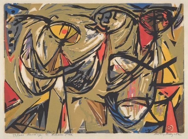 Curator: Here we have Gary Wragg’s "Mask," a mixed-media piece dating to 1976. It's a striking example of his abstract expressionist approach. Editor: Whew, it's wild! It feels like an explosion in a paint factory. Kind of chaotic, but there's this underlying energy I'm drawn to. I can definitely see that name—'Mask'—lurking somewhere within all of the gestural brushstrokes. Curator: The title "Mask" encourages us to consider the representation of identity and the self. In 1976, Wragg was engaging with debates around representation in art, specifically in relation to broader social and political dialogues concerning identity and the construction of the self through performativity. How does this mask function in this sense? Is it protection or concealment? Editor: Maybe both? Like, we all wear masks, right? This one just feels…raw. The textures—the scribbles, the thick paint, the thin washes—they speak to this messy human experience of hiding and revealing ourselves simultaneously. Reminds me of when I first tried painting; total abandon, straight from the gut. I reckon a bit of myself is revealed if you look close enough! Curator: I agree, the layering and the mixed media add to the sense of complex personae. What is particularly striking to me is that, rather than working from a canonized image, the piece comes directly from a period of abstract mark-making as the end product of the painting, the art of a performative, individual freedom of the 1970's counterculture. Editor: And yet, doesn't it feel current? It almost reminds me of street art, all these overlapping layers like graffiti over time. It's funny how art from the past keeps talking to us in new ways, across these divides, right? It's just like history painting itself. Curator: Precisely. Wragg's "Mask" compels us to consider how societal norms and our internal lives impact and challenge how we perceive our realities, whether historically or today. It reveals much about our existence by showing and allowing space for our perception of seeing beyond the painting. Editor: Absolutely, "Mask" demands that you feel something. Art is best like that. Thanks, Gary!