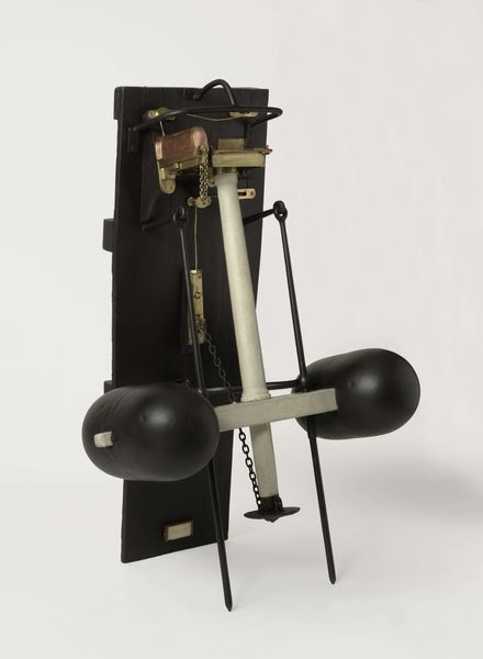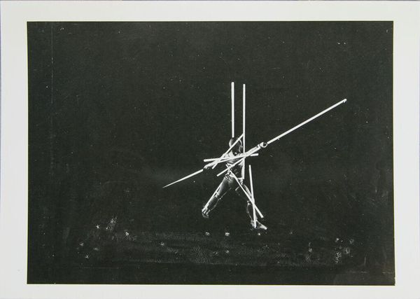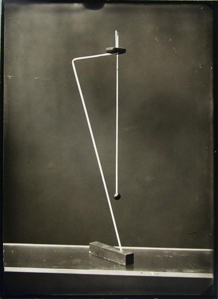 Curator: My first impression is… it’s strikingly cold, yet intensely focused. Editor: Indeed. Here we have Douglas Abdell's "Phrae-Yad," created in 1971. What you see before you is a monochrome photograph of, primarily, a metal sculpture. Abdell's work frequently engages with minimalist forms and the weight of cultural symbolism, which seems potent here. Curator: Absolutely. The polished metal—maybe steel? Chrome? Whatever it is, it gives it this air of untouchable, almost clinical perfection. But that central form, with the spear-like extension, it feels almost aggressive, primal. Like technology trying to mimic ancient power. Editor: The sculpture itself can be considered in terms of its industrial materiality and production. It's interesting to see such smooth metal rendered as this angular totem. The sharp edges, precise lines... how do these qualities engage in relation to the photographic medium capturing it? This monochrome flattens depth and emphasizes these austere textures and the social and technological contexts in which Abdell worked are vital. Curator: The choice to photograph the sculpture in monochrome, against such a nondescript backdrop, feels intentional, doesn't it? Like he’s stripped away anything that might distract from its stark form and allows you to create a unique meaning or feeling, it seems almost defiant of its materials. Is it stable or precarious? Is it meant as a pedestal or something to skewer an offering? Editor: That duality is definitely at play here. Metal, generally industrially forged or manufactured and mass produced becomes a totemic sculptural image referencing possible sacrifice. Abdell transforms ordinary commodities through his manipulation of form and medium, prompting reflection on consumption and the artistic hand, even though the artistic hand here is creating something of high precision rather than say the handmade characteristics found in painting or collage. Curator: In short, it manages to be both very cold and powerfully suggestive simultaneously. It sticks with you. Editor: It certainly asks a lot from the viewer, both formally and conceptually. Hopefully we’ve opened a pathway into its complex layers for you.