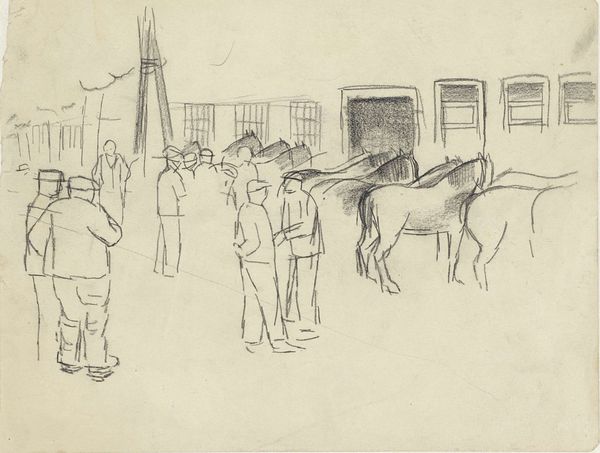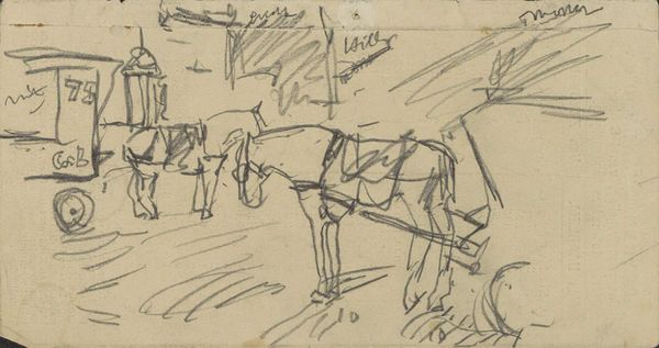 Editor: Here we have "Wachtende paarden," or "Waiting Horses," a pencil drawing by George Hendrik Breitner, created sometime between 1867 and 1923. The sketchiness creates a feeling of impermanence; the scene is bustling but subdued. What catches your eye in this piece? Curator: What I find striking is how Breitner uses the horse, a historical symbol of power and nobility, in this fleeting, almost mundane context. Look at their bowed heads, their stillness. Does this not challenge the conventional representation of the animal? Editor: Absolutely. Usually, we see horses in dynamic poses, full of energy. Here, there’s a weariness. Is Breitner commenting on the changing role of horses in urban life during this period? Curator: Precisely! The rise of industrialization began shifting reliance from animals to machines. Breitner's impressionistic style captures this moment of transition, using symbolism that transcends the single moment. He presents horses no longer as symbols of status or power, but rather entities caught within an evolving societal narrative, performing labor. What lasting message do these "waiting horses" leave us? Editor: It suggests themes of obsolescence, but also patience and endurance. Despite the changing world, these creatures persist, perhaps reflecting something about the human condition as well. Curator: Precisely. By juxtaposing the symbolic weight of the animal against the mundanity of their waiting, Breitner invites us to reflect on our own relationship to progress and tradition. Editor: I see the layers so much clearer now. Thank you for untangling the web of historical and emotional symbols! Curator: My pleasure. It is the convergence of history, culture, and art, which creates layers of stories, inviting an ongoing exploration of collective memory.
