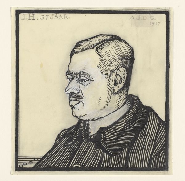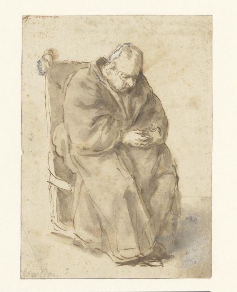 Paul Mathey created this print, "Portret van een geestelijke" or "Portrait of a Clergyman," using etching techniques. The image has a subdued tonal range, dominated by light grays and browns, which gives it a muted, solemn atmosphere. The composition directs our attention immediately to the clergyman. Mathey uses hatching and cross-hatching to define form and create depth, particularly noticeable in the rendering of the robes and facial features. The lines are dense in areas of shadow and sparse in areas of light, illustrating both the texture of the fabric and the contours of the face. Note how the slightly downward gaze and the clasped hands convey humility and introspection. In its structure and detail, the print resonates with the Symbolist movement’s interest in interior psychological states and the representation of human character through symbolic visual language. The clergyman's somber demeanor, combined with the technical precision of the etching, invites contemplation. The artwork embodies a study in contrasts, capturing the visible form and the implied, internal world of its subject.