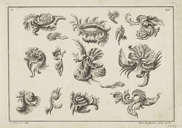 Curator: Well, hello there! Today, we’re looking at "Voluut- en bladvormige rocaille-ornamenten," which translates to Volute and Leaf-shaped Rocaille Ornaments. It's a drawing by Johann Georg Hertel, created sometime between 1727 and 1775. You can find it here at the Rijksmuseum. Editor: Ah, immediately I'm seeing whimsy. The whole composition feels light, almost playful, doesn't it? Like a little dance across the page, all curves and flourishes. I can almost hear the harpsichord music accompanying these shapes. Curator: Absolutely! These ornaments exemplify the Rococo style, with its emphasis on asymmetry, elegance, and the natural world. Notice how the volutes and leaves, the key visual motifs, are stylized and flowing. These motifs had symbolic importance, representing vitality and the endless cycle of growth. It echoes a certain optimism inherent in that era. Editor: Optimism laced with powdered wigs and courtly intrigue, maybe. I love how these drawings, despite their age, possess a kind of immediate energy. There’s something so intimate about sketchbooks; like catching a glimpse into the artist's private thoughts as they toyed with different forms. Curator: Indeed! You feel that Hertel used pen and ink in a very exploratory way. Artists like Hertel utilized these motifs as building blocks for larger decorative schemes—think furniture, architectural details, even silverwork. These seemingly minor drawings provided a visual language, helping to transmit ideals of sophistication across society. Editor: They're a visual shorthand for opulence, aren't they? Each little curlicue practically screams, "Look at me! I am tastefully expensive!". There’s an echo of that theatricality still alive in design today – maybe it’s a human instinct, this drive to ornament and embellish our surroundings. Curator: Yes, ornamentation helps carry a cultural memory. The very act of replicating and adapting these shapes connected the artisan to a lineage of skilled craftsmanship, reinforcing shared values. Editor: That’s it, it is a historical through-line – this constant desire to find visual pleasure in design. Thanks for letting me muse on it! Curator: My pleasure, such exploration has enriched our understanding today.