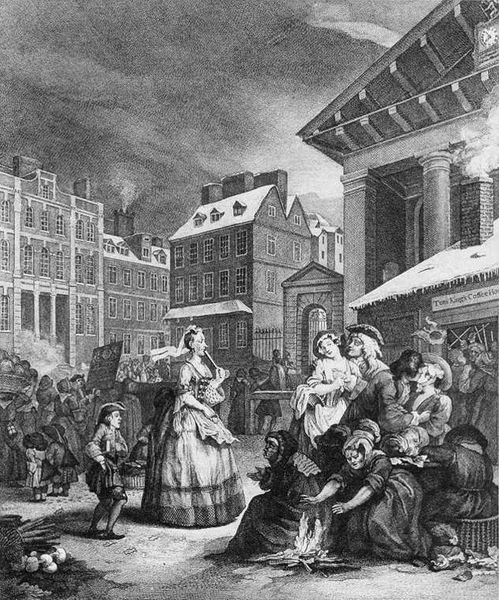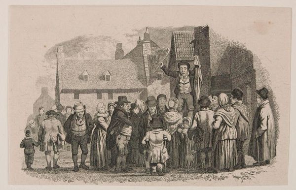 Editor: This is William Hogarth’s engraving, "Times of the Day, Noon," created in 1738. It feels almost like a chaotic snapshot of 18th-century London. What a busy, crowded street! I'm curious, what do you see happening in this piece? Curator: Oh, I love getting lost in Hogarth’s world! To me, it's a visual opera. Each character is singing their own tune, contributing to this raucous symphony of everyday life. Look closely – you have the upper class emerging from the church. Pompous, probably gossiping already, juxtaposed with the street urchins below. The narrative's sly, isn’t it? It's got that pinch of irony I find delicious. Editor: It's interesting that you see an opera, I hadn’t thought of it like that. The contrast is stark, especially between the pristine clothes of the churchgoers and the, shall we say, unfortunate mess near that poor child. Is Hogarth making a specific point about class divisions? Curator: Absolutely! Hogarth was a master of social commentary. He held up a mirror to society, showing both its beauty and its blemishes. That 'unfortunate mess,' as you delicately put it, isn't just there for shock value. It’s symbolic! It shows the disregard, perhaps even obliviousness, the wealthy had towards the lower classes and the consequences of such ignorance. Did you catch that detail of the lady being kissed on the neck? So juicy! Editor: Now that you point it out I do! So many little dramas within one image. The “operatic” comparison is really sticking now. I really like that, thank you. I’ll look closer at the details now; the symbolism and societal critiques give it much more meaning. Curator: Wonderful! Remember, art’s a dialogue, always changing with our perceptions.