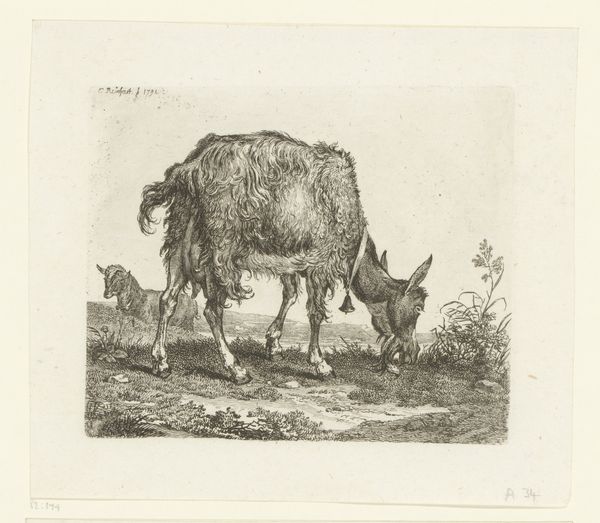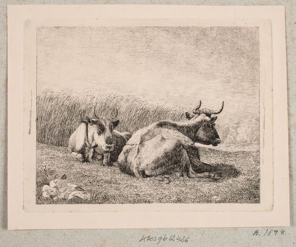 Editor: Here we have "Cows in the Landscape," an etching by Jean Louis Demarne, likely created sometime between 1762 and 1829. The subdued tones give it a peaceful, pastoral feel, but I’m also struck by how matter-of-factly the cows are depicted. How do you interpret this work, especially given its historical context? Curator: The artist isn't just showing cows, they are offering a commentary on labor, ownership, and the rural landscape. Think about the time this was made. Land was being enclosed, changing from common usage to private property. These cows, and the farmers connected to them, are caught in that shift. Consider the subtle hierarchies within the composition – one cow stands tall, seemingly confident, while the other rests. Editor: That's fascinating. I hadn't considered the social implications. The composition, now that you mention it, does feel less idyllic and more... observed. Does the technique – the etching itself – contribute to this reading? Curator: Absolutely. Etching, with its capacity for fine detail, allows Demarne to capture the textures of the animals' hides and the roughness of the terrain, rooting the scene in a specific, tangible reality. These were the realities of the animal conditions, and the human labor, powering society and enabling social exploitation. I would want to know the original dimensions. Scale often contributes to conveying (or masking) implicit political statements. Editor: That's really changed how I see this piece. It's not just a pretty picture of cows; it's a glimpse into a complex social and economic reality. Curator: Exactly. And by understanding those underlying structures, we can appreciate the depth and relevance of seemingly simple subjects like this one. We can better realize how inequity has remained constant and look for strategies to dismantle exploitation in all forms. Editor: Thank you, I see how important it is to view artwork through many lenses, and not be afraid to dig into complex issues when interpreting the meaning. Curator: My pleasure. The more contexts we consider, the richer our experience becomes.