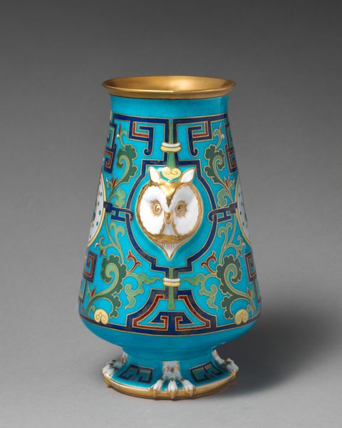 Editor: This exquisite porcelain vase, crafted by Christopher Dresser between 1862 and 1872, just exudes a sense of opulence and sophistication. The turquoise backdrop makes the intricate floral designs pop. What stands out to you in this piece? Curator: It's a fantastic object for considering cultural exchange and power dynamics of the Victorian era. Dresser was deeply influenced by non-Western art, particularly Japanese design, and Islamic patterns. He championed "truth to materials" and function, aligning with the Arts and Crafts movement, but can we really separate his appropriation of global aesthetics from the backdrop of British colonialism and its influence on those aesthetics? What do you make of the seemingly harmonious fusion of Eastern and Western motifs? Editor: That's a compelling point. It feels complicated now, appreciating the vase’s beauty while being aware of the historical context in which it was created. Does this then put the vase at the centre of intercultural exchange and exploitation? Curator: Exactly! On the one hand, we see Dresser genuinely admiring and integrating design principles from different cultures. Yet, his work also highlights the Victorian tendency to consume and exoticise these cultures without necessarily understanding them. The turquoise might allude to the color preferences gaining traction, however it simplifies an entire history to its mere face value. How does viewing it this way affect your perception? Editor: It adds so much depth. I see how a seemingly beautiful object becomes a focal point for bigger questions about cultural appropriation, artistic intention, and historical accountability. I am forced to view the Arts and Crafts Movement from the eyes of cultures which are not always taken into account. Curator: Precisely! Examining these intersections allows us to challenge the dominant narratives and recognize the complexities inherent in art history. By adopting perspectives from multiple actors we enable others to think in different avenues as well!