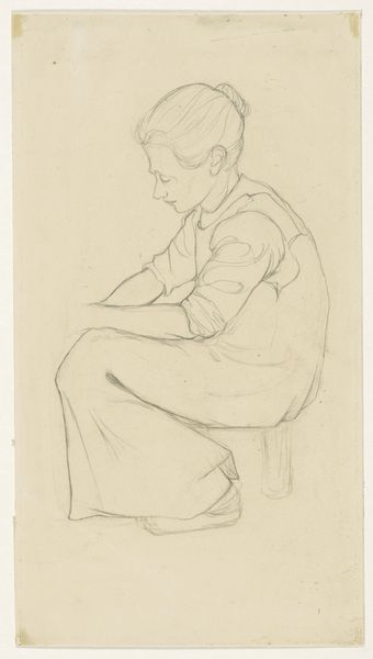 Curator: Here we have Jac van Looij's pencil drawing, "Zittende jongen," which translates to "Seated Boy," created sometime between 1865 and 1930. Editor: There's a stillness to this drawing that immediately grabs me. The boy’s gaze, the clasped hands... it all hints at a story unspoken. It's rendered in simple, muted shades; almost somber. Curator: It's a realistic drawing, a study of youth and perhaps a moment of contemplation. Considering its historical context, we can look at how images of working-class youth were portrayed during that time, particularly their forced entry into labor at early ages and what childhood meant then. Editor: I notice how van Looij focuses intently on the boy’s face and hands, almost minimizing the rest of his body. Those are the points where we read his emotions, even with the limitations of a simple sketch. The crossed hands form an almost iconic image of quiet desperation. Curator: Absolutely. And the fact that the child is seated—not actively working—can be interpreted in many ways, considering labor laws and the fight to institute any protection for children, even at the turn of the 20th century. What does the artist seem to be implying by choosing to capture this moment? Editor: Perhaps it represents an interstitial space; that moment of stolen rest but with awareness that any peace will only be momentary. There is a symbolic quality about his slightly oversized overalls that makes me think he will literally 'grow into them,' just as he has to metaphorically grow into the adult world. Curator: That speaks to how images have layers that deepen over time. Thank you, it’s a fascinating point. Editor: My pleasure. I’ll certainly be thinking about this one.
