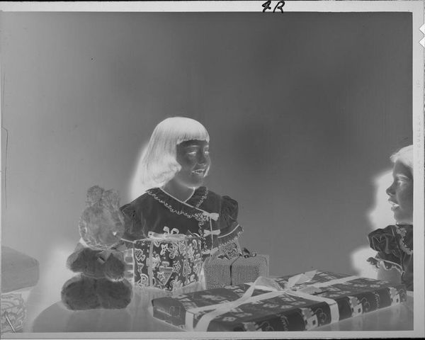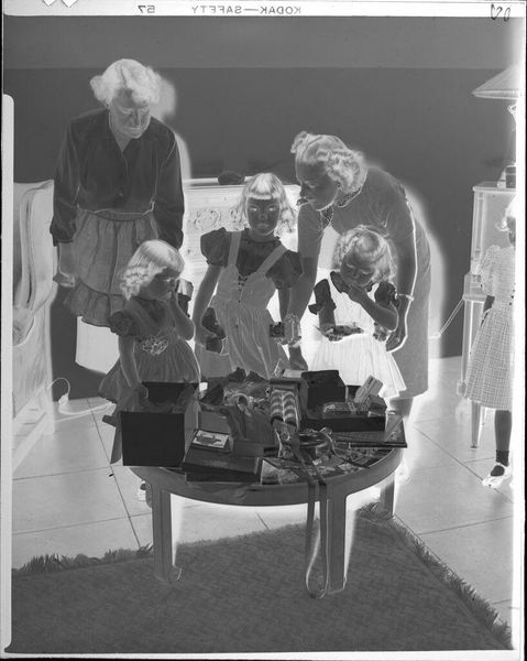 Curator: This striking image, whose title is simply Untitled, comes to us from Martin Schweig. It captures a young woman opening a gift, while a man beside her examines another. Editor: It's a disquieting scene, isn't it? The reversed tones lend an eerie quality, almost like a ghostly memory of a celebration. Curator: Exactly. Considering the socio-political context of the mid-20th century, the image prompts questions about gender roles and expectations, about the performance of receiving and giving. Editor: How do the gifts function here? Are they symbols of affection, obligation, or perhaps even control within a relationship? There’s a sense of imbalance, wouldn't you agree? Curator: I do. It speaks to how power dynamics are often invisibly wrapped within social rituals. We can only speculate, but the photograph freezes a loaded moment. Editor: It reminds us that even seemingly innocuous scenes reflect larger societal structures—worth contemplating today.