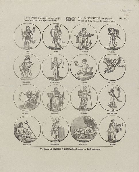 Curator: This intriguing print is titled "De boer met eieren," or "The Farmer with Eggs," dating to around 1843 and attributed to F. Steub. It's a fascinating tableau, almost like a comic strip before its time. What catches your eye? Editor: It has a sort of dark whimsy about it, like a proto-graphic novel dealing with peasant life. I'm curious about the intended audience. Was it meant for the educated elite or a broader public? Curator: That's a crucial question. The medium is a print, meaning it was reproducible. Prints in this era served a variety of purposes, from political satire to instructional material. Looking at the caricatured figures, and the snippets of text, my sense is it was targeting the burgeoning middle class, who were increasingly literate and eager for accessible forms of entertainment and social commentary. Editor: So, these images served as a kind of visual currency, circulating within a particular social sphere, perhaps reinforcing certain ideologies about rural life and trade. I’m interested in the relationship between the images and the captions. They create a mini-narrative across the page that engages us. Curator: Precisely! The text adds another layer, suggesting stories about trade and possibly social interactions of that time. Editor: Are the individual frames offering critique of rural life, perhaps pointing to economic hardships or social inequities through humor? The farmer carrying eggs seems a symbolic worker making his way across multiple transactions of everyday existence. It feels like a statement on class division of labor, made lighthearted by this method of printed dissemination. Curator: Absolutely. These images tap into common social anxieties, using the figure of the farmer and the exchange of eggs as a lens through which to examine economic and social dynamics. Editor: This artwork feels like more than just art—it is more akin to a social document that highlights nineteenth-century ideas and tensions related to class, labor, and market economies in accessible forms for the modern eye. Curator: Indeed, Steub's print cleverly captures the cultural climate and the power dynamics woven into daily life through humor. It's something to see in such an early moment.