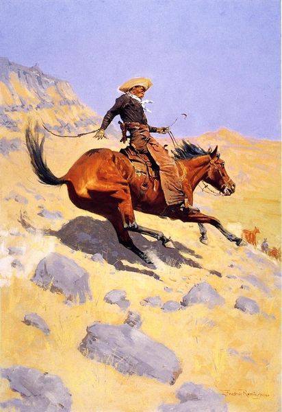 Charles M. Russell made "Wild Meat for Wild Men" with oil on canvas, a common technique in his time. Russell's work provides insight into the romanticized vision of the West in the late 19th and early 20th centuries. Oil paint allowed Russell to capture the drama and action of the hunt, but it also served to create an image palatable to Eastern audiences, reinforcing popular ideas about cowboys and Native Americans. The labor involved in painting itself – the physical act of applying brushstrokes to canvas – is less visible here than the labor depicted: the dangerous work of the hunt. However, this belies the true cost of that labor. The painting romanticizes the act of hunting buffalo, obscuring the real story, that its industrial-scale slaughter led to the near extinction of these animals. The buffalo hunt was a traditional practice for sustenance, but with colonization came commodification. Ultimately, understanding the materials and social context behind "Wild Meat for Wild Men" allows us to unpack the complex layers of history, labor, and representation embedded within this seemingly straightforward image.