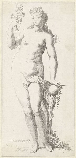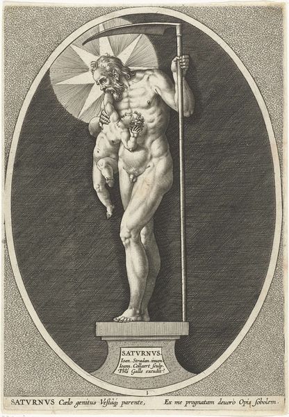Curator: As you can see, Jacob Matham rendered this image, Diana als Luna, likely sometime between 1589 and 1593. He used an engraving technique. Editor: My first thought is striking: the light pouring out, seems almost tangible. But then the figure... turned away from us like that, I sense both power and perhaps an aloof sadness. Curator: Indeed, the contrapposto of her stance invites the viewer's gaze, though her back faces us. Matham has also constructed a visually complex composition with radiating lines emanating from behind Luna’s head that lead to the inscription in the lower corner. We can use semiotics to decode what appears like a performance of power. Editor: This work circulated, didn't it? Considering its social role, was it purely for artistic admiration? The nudity and classical subject matter--it's a statement, a political assertion through the mythology. The moon as a symbol also gives us context of its public reception. Curator: Absolutely. The mythological is intrinsic in this period and culture. Structurally, note how the starkness of the figure is positioned relative to the nebulous clouds which creates contrast within the limited tonal scale afforded by the engraving. Consider the implied textures– the cloud versus skin; Matham employs cross-hatching strategically. Editor: Those lines serve an interesting symbolic role within the social atmosphere too. Lines are boundaries and here they represent a certain way that Diana's story would circulate through different communities, a way that society will come to know who she is. Curator: It offers an elegant framework when attempting to comprehend art history from this period, agreed. Viewing the work solely from a historical view, or formal view is to see but half the argument presented. Editor: Precisely. Through Matham's artistic language, the themes and imagery are able to invite ongoing dialogues across time.