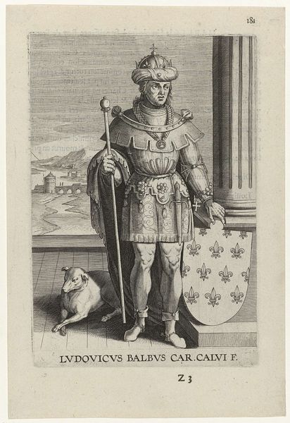 Curator: Here we have Philips Galle's "Portret van Karel de Kale," an engraving dating back to 1603, now residing here at the Rijksmuseum. What strikes you about it? Editor: The steeliness, the literal armour plating! He looks like he's ready for battle, or at least posing to suggest such readiness. There is very little vulnerability here, this is an image meant to project strength, dominance, and, of course, the authority of a monarch. Curator: Precisely. This isn't just a portrait; it's a statement. Galle was known for his engravings that circulated widely, shaping perceptions of historical figures. The context is crucial here; consider the power dynamics of the era, the role of monarchs, and how these images functioned as propaganda. Editor: Propaganda, absolutely. Think about how carefully this image would be curated, who gets access to it, and the message that's being deliberately conveyed. I wonder about Charles the Bald himself – did he have any agency in how he was depicted? Curator: Galle created this work centuries after the death of Charles the Bald. It's about constructing an image of power in a very specific early modern context. We see the fleur-de-lis motif, a powerful identifier. It's fascinating to consider the political forces at play when crafting and disseminating imagery such as this. It's also worth noting the landscape in the background and the symbolic items around him: a sword, the shield and the column. Each item is supposed to enhance the impression of kingship. Editor: All these strategically positioned details amplify an ideal. We need to also interrogate the visual language of power—the semiotics, even—embedded in something seemingly straightforward like this. It is about historical context, as you say, but it's also about critiquing those power dynamics, unveiling the inherent ideologies being promoted and who they're excluding. This is about interrogating historical image making. Curator: Indeed. What seems like a simple depiction is actually a dense tapestry of social and political intentions. The distribution networks also affected perceptions. Images could legitimize claims to power but also become the focus for critics in broadsides and satires. Editor: Yes, the meaning of this artwork lives as much in the context of its time as in what we can glean about our own through interrogating images such as this today. Curator: Looking closely at pieces such as this also gives us great insights into printmaking and how social messaging would move through society in early modern Europe. Editor: And for me, it challenges us to unpack power— who is represented, who is left out, and what unspoken rules exist within these images from history?