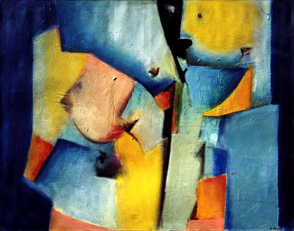 Curator: Here we have Amadeo de Souza-Cardoso's "Instrument’s Life," dating from around 1916. The medium is oil on canvas. Editor: Wow, what a trip! My first thought is just sheer…energy. It feels like the music's leaping off the canvas, all jazzy and a little chaotic. Curator: Indeed. Souza-Cardoso synthesizes Cubist fragmentation with Futurist dynamism here. Note the way the planes intersect and overlap, suggesting movement and multiple perspectives simultaneously. Editor: Exactly! It’s not just *looking* at a guitar, it's the feeling of the music pouring out, vibrating through space. Plus, those colors – the bold yellow against the red and blues – give it such a playful, almost rebellious vibe. Like, “Hey, I’m a guitar, but I’m also…something else entirely!” Curator: One might argue that Souza-Cardoso deconstructs the very essence of musical form. He isn’t merely representing the instrument; he's analyzing its components and reassembling them according to his own subjective vision. Editor: Sure, there’s that too! But can’t we just dig the vibe? It’s a bit like looking at a painting that's trying to play you a song… badly. Endearingly badly! The artist uses these jarring contrasts that create the syncopated rhythms; notice too how the composition leads your eye around the whole piece to enjoy that energy. Curator: I concede your point. Its non-mimetic structure forces the viewer to actively engage in the creation of meaning, rather than passively receiving a pre-determined representation. The materiality of the painting—the texture, color and layering—contributes fundamentally. Editor: Totally. This painting doesn't let you off the hook. It pulls you in, shakes you up, and spits you back out with a new appreciation for… well, whatever it is Souza-Cardoso was trying to say. And I’m really grateful for the visit. Curator: The exercise in analyzing its abstract features through synesthesia encourages us to challenge representational expectations and recognize how colors and fragmented imagery communicate beyond words. Editor: Agreed! Now I want to go dig out my own dusty guitar and make some noise. Terrible, glorious noise.