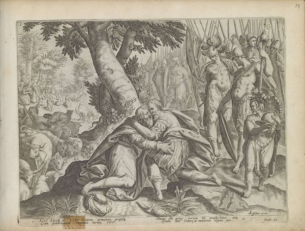 Pieter Serwouters created this print, "David verslaat de beer en de leeuw", but we don’t know exactly when. The image captures David, a young shepherd, protecting his flock, an iconic scene emphasizing courage, faith, and divine protection. During the Dutch Golden Age, when Serwouters was active, there was a profound sense of national identity intertwined with religious and moral narratives. Here, David symbolizes the virtuous protector, a fitting allegory for the Dutch Republic defending its newfound independence. Consider the cultural and religious context: the print would have resonated deeply with a society that had just fought for its freedom. David's youthful vulnerability, juxtaposed with his bravery against the wild animals, speaks to a broader theme of overcoming adversity through faith and inner strength. It suggests that anyone, regardless of their background, can rise to meet monumental challenges. The print evokes themes of faith, courage, and the triumph of the underdog.