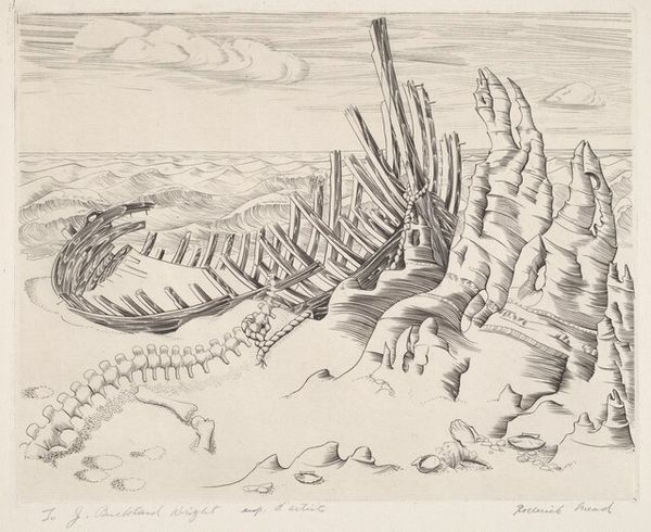 This etching by William J. Scott captures a dramatic landscape with a lone rider, made with some kind of metal plate and acid, I imagine. The texture is incredible, created through dense, rhythmic lines that carve out the forms of the mountains and the sky. Look at how the light seems to ripple across the rocks, a constant back and forth. There is a sense of both meticulous planning and free-flowing spontaneity in the mark making. I'm drawn to the rider in the foreground, so small against the immensity of the landscape. It's like a little scribble that adds a layer of narrative mystery to the whole scene. Scott’s composition reminds me a little of some of the landscapes of Gustave Doré, that same sense of romantic awe and the sublime. Ultimately, this print invites us to contemplate our place within the vastness of nature, but also the way we make our mark.
