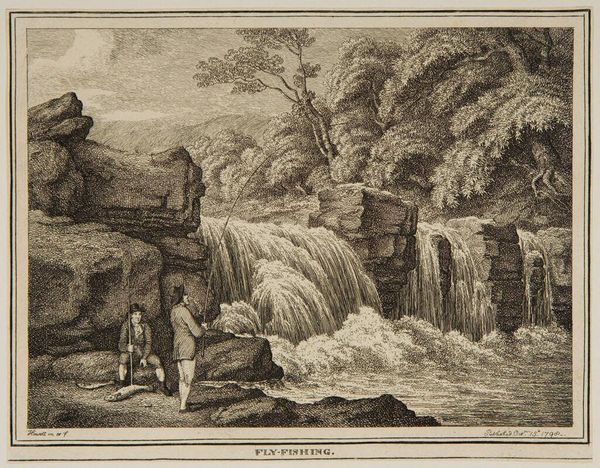 Editor: This is Jean Jacques Leveau's "The Italian Aqueduct," currently residing at the Harvard Art Museums. The composition is striking, the aqueduct cuts across the landscape and draws the eye. What key elements do you see at play in this work? Curator: Notice the interplay of light and shadow, how it sculpts the forms of the aqueduct and the surrounding terrain. The use of line is also critical; consider how the artist employs hatching and cross-hatching to define the textures and spatial depth. How does that effect your reading? Editor: It definitely adds a sense of realism to the rendering of the stone and water. I see the figures and animals at the bottom provide a sense of scale too, and make the aqueduct seem all the more impressive. Curator: Precisely. The proportional relationships between the elements—landscape, architecture, figures—contribute to the overall balance and visual interest. Ultimately, Leveau's mastery lies in his manipulation of visual elements to construct a complex, unified whole. Editor: I see it now! It's like he created a world within the image, relying on form and technique. Curator: An excellent observation!