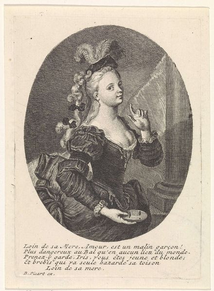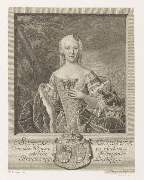 This is Cornelis van Noorde’s diminutive portrait of Wilhelmina van Pruisen, held at the Rijksmuseum. Executed with fine lines, the print captures the sitter in exquisite detail, framed against a stark background that accentuates her elaborate attire. Van Noorde has rendered the princess with great precision. Notice how the lines create subtle tonal gradations. The interplay between light and shadow models her face and emphasizes her elegant bearing. The artist has expertly manipulated line work to suggest texture, from the soft curls of her powdered wig to the plushness of her fur stole, adorned with delicately rendered roses. The composition draws the eye to Wilhelmina’s serene expression, imbuing her with a composed, almost ethereal presence. The careful articulation of her clothing and jewelry, in contrast with the somber background, highlights the cultural codes of status, wealth, and femininity. Consider how the portrait functions as both a representation of an individual and a carefully constructed image of power and grace. It invites ongoing interpretation within its historical and cultural context.