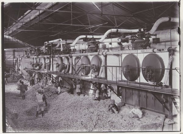 Curator: Immediately striking is the mechanical presence, the sheer scale and intricacy of the factory machinery dominating the composition. There's a geometric interplay and a focus on the materiality of these objects that holds one’s attention. Editor: Yes, my immediate response is darker. While the shapes and patterns of industry are visible, I cannot ignore how this aesthetic is directly implicated in colonial labour exploitation, judging from the name of the factory that translates from Dutch as 'Machines and Workers in a Hall of the Boedoeran Sugar Factory'. Curator: Precisely, the geometry lends itself to modernism. This vintage photograph, believed to have been captured circa 1925-1930 by the photographer Isken, presents a cityscape…or rather, a factory-scape with impressive command of the monochromatic palette. Editor: Beyond the purely aesthetic, consider the geopolitical dimensions of it. How does the mechanization and labor of the sugar factory in Java speak to the global flow of capital during the colonial era? We see those themes expressed even through the organization and layering of figures—mechanical parts versus human laborers in this composition. Curator: I understand your concerns, and I do appreciate that you raise them. However, there's still an elegant quality to the rendering of space and light here, regardless of its context. Observe how the light hits those large industrial wheels on the left, contrasting with the shadowy interior. A play of sharp angles against organic shapes in the pile of refined white pulp too. Editor: The bright spots give focus to the areas of labor; the rest becomes a blurred or dim backdrop. Let's remember what “refined” truly meant in those times for people under colonial subjugation. How did sugar refinement create sweetness elsewhere through harsh labor practices on Java? Curator: The visual narrative balances precision with an evocative ambiance. The formalist elements create a scene that’s both industrial and quietly pictorial, speaking to an appreciation of order and mechanical innovation that existed at that time. Editor: Right, a certain visual order masks deeper discord that we are now seeing more clearly. Let this image inspire contemplation on exploitation hidden in plain sight during that colonial era of industry. Curator: A fascinating example of modernist photography that uses sharp lines and subtle contrasts to portray its subject, forcing a discussion about ethics along the way. Editor: It shows the historical echoes still palpable today. Thank you.