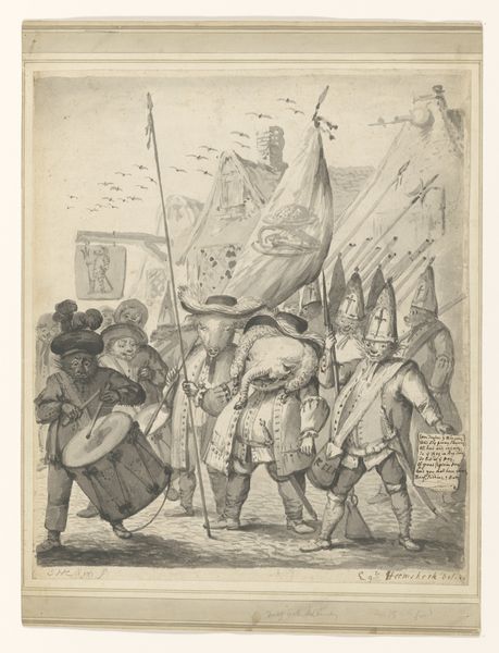 This etching, Spaanse schelm Gusman d'Alfarache en soldaten, was created by Jan de Bray, a Dutch Golden Age painter, draughtsman and etcher. The printmaking process involves painstaking labor. De Bray would have started by meticulously incising lines into a metal plate, using tools to create the composition. The depth and density of the lines determine the gradations of light and shadow. This is then inked and printed, transferring the image onto paper through intense pressure. The image shows a theatrical encounter between a group of soldiers and a figure gesturing towards the viewer. The lines give texture to the clothing and suggest the weight of the soldiers' weapons. The meticulous work involved in the etching process elevates the scene beyond a simple illustration. It invites contemplation on themes of power, social order, and the human condition. By considering the labor and skill involved in this etching, we gain a deeper appreciation for the artistic choices and the stories they tell. This challenges the distinctions between fine art and craft.