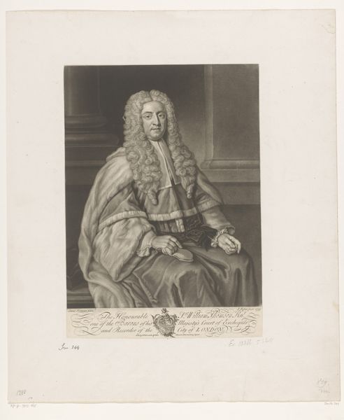 Curator: Have you had a chance to view Carlo Domenico Melini’s engraving, "Portret van Charles-Joseph de Pollinchove," made around 1765? It’s quite something. Editor: Yes, my first thought was that it embodies the essence of dignified repose. There's a quiet confidence radiating from the subject, but a kind of formal severity too. What strikes you most about the work? Curator: Oh, it's got this incredible weight to it, hasn't it? The formal attire, the theatrical background… It really says “power,” doesn't it? The man looks pretty darn self-important. Makes me wonder what he’s like behind closed doors. Do you think the semiotics of this baroque artwork say much about its history? Editor: Undoubtedly. The strategic composition draws your eye immediately to his face, the focal point, really. Notice how Melini uses light and shadow—chiaroscuro if you will—to enhance the three-dimensionality, crafting both physical presence and highlighting a man of perceived power. Curator: Yeah, it is all very calculated, isn’t it? Even the flourish of the signature seems strategically placed to show the importance of… Melini himself? Ha! Also what’s up with that ridiculous wig? I bet it took hours to make. I can’t imagine having all that hair stuck to your head all day. Bet it itched! It is like wearing a small poodle. Editor: Indeed. The baroque love for extravagance is well documented here: but what is of particular note to me is the very medium used. As an engraving, each line and dot requires immense precision, mirroring, perhaps, the meticulous order De Pollinchove was expected to maintain within the legal system he oversaw. Curator: Makes me think of bureaucratic perfection versus the messiness of human experience… Editor: Precisely, art becomes a silent witness to power dynamics of that historical era, reflecting not just the man, but the machinery around him, rendered perfectly visible. Thank you for bringing that to light. Curator: Well, what a portrait indeed! Gives me something to consider beyond face value, anyway. Thank you.