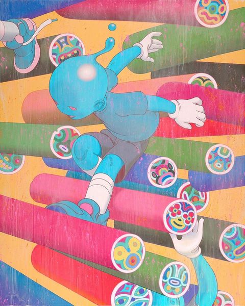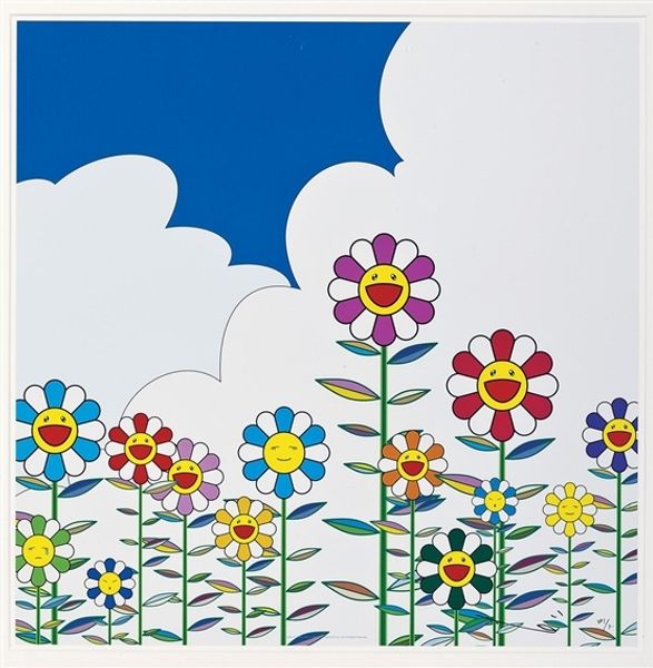 Takashi Murakami made ‘Planet 66; Summer Vacation’ in, well, sometime - it is undated. It's an image made with clean lines and colors, and that flatness kinda makes it pop. You know, like a cartoon but fancier, like a painting. The baby ghosts or whatever they are float like they’re swimming through the air, and their shapes are repeated with slight variations, which kinda gives the piece a rhythm. Down below are the flowers, each one different, all grinning at you, it's pretty joyful! I keep thinking about the way that bright blue is so flat, it’s like a wall. Then these cartoon figures press up against the picture plane. There's a little ghost character in the upper right, its got this long sort of sheet-like tail, and little round spectacles. It's so simple, yet so expressive, almost like a Cy Twombly scribble, in its simplicity. Murakami brings to mind other artists who use pop imagery, like Warhol. But in his own way, Murakami’s work is all about making art accessible, and I am here for that.