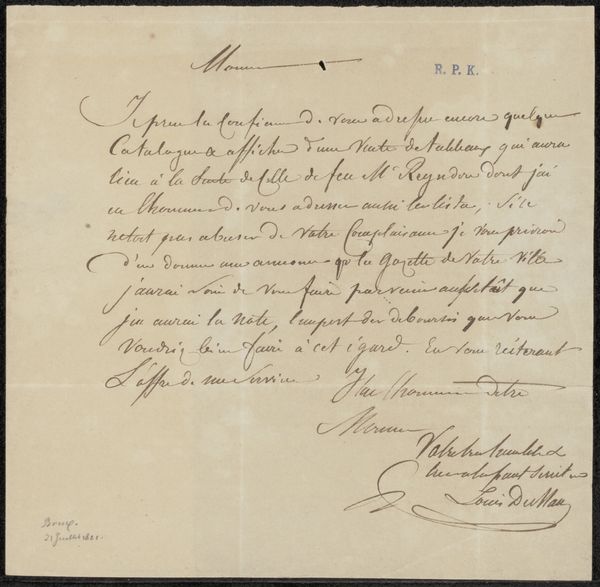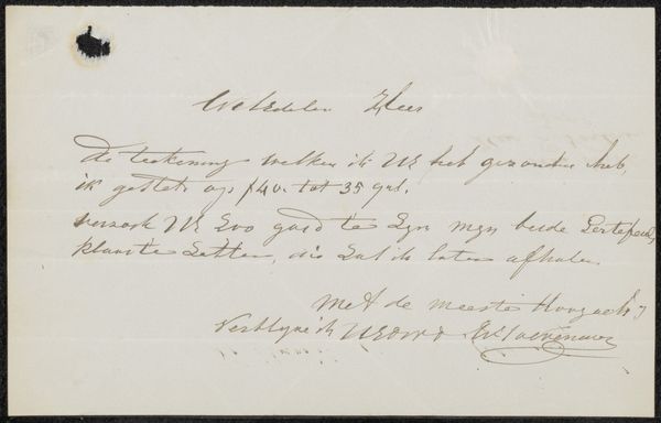 Curator: This intriguing piece, possibly created between 1863 and 1866, is entitled "Kwitantie voor Maurits Leon en Jacob Taanman," or "Receipt for Maurits Leon and Jacob Taanman." It's housed here at the Rijksmuseum. Editor: You know, before even reading the title, I felt an intimate, personal energy emanating from this, like a glimpse into a private journal or a treasured memento tucked away in an old drawer. It's like history breathing, wouldn't you agree? Curator: Indeed! It's a pen and ink drawing on paper by Frans Buffa en Zonen, so right away you get the sense of the everyday. The artistic intention feels…practical. This isn’t meant for a gallery, but more a functional object. Editor: Function, yes, but the swooping calligraphy and almost dreamlike flourishes hint at artistry brimming just beneath the surface. Observe how the ink bleeds ever so slightly into the page. What might appear simple contains immense character. The hand, the moment – it’s beautifully imperfect. Curator: If we dissect it further, the layout creates a subtle yet discernible structure. The alignment, spacing, contrast in weights, between what might be a ledger entry and the signatures... it hints at order underlying what appears informal. The pen strokes, though fluid, adhere to the implicit grid the artists design. Editor: You're right, it does provide balance, though the heart flutters in the details. These hand-drawn letterforms evoke memories of elegant correspondences and times gone. I almost imagine the artists taking breaks for strong coffee! Can’t you smell the rich history trapped in that ink? Curator: I appreciate that interpretation. In my view, that this receipt is considered art emphasizes a shift in artistic perception. Elevating the mundane—the act of recording transactions—into a work worthy of display prompts questions about worth, artistic skill, labor and artistic merit. Editor: Perhaps it is the humblest artifacts that have most power! Look again at this sketch; its seeming ordinariness reminds that artistry lies not only in grand statements but the whisper of everyday life. That sentiment leaves me with a powerful peace.