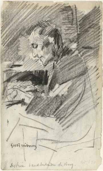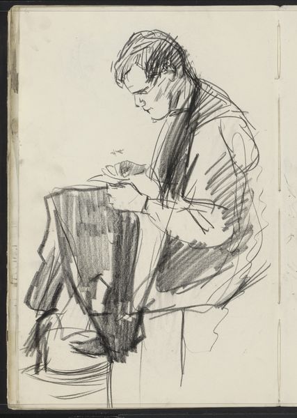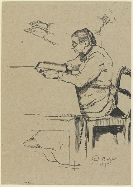 Henri de Toulouse-Lautrec made this artwork, 'A Saint Lazare, Song Title,' using lithography. It is printed on paper, a readily available material, allowing for the efficient reproduction of images. The stark black lines against the white background capture a solitary figure writing at a table. Lithography enables a directness of mark-making, similar to drawing, and this spontaneity is evident in the fluid lines that define the woman's form. The image is simple, yet suggestive, and speaks to the labor of communication. The print’s accessibility as a medium also invites consideration of its social context, as prints were often used to disseminate images and ideas widely. In thinking about the artwork, it is important to remember that seemingly simple processes like drawing, printing, and writing, carry cultural weight and social significance. They challenge conventional notions of high art by democratizing access to artistic expression.
