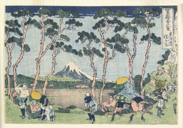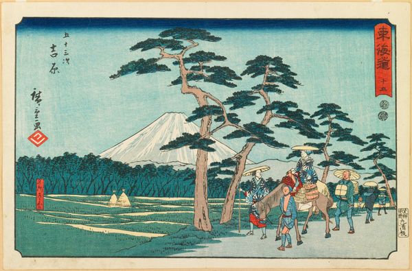 Keisai Eisen's "Evening Glow at Nihonbashi" is a woodblock print that captures a bustling scene with a harmonious blend of colors and forms. The composition is meticulously arranged, with a focus on the geometric structure of the bridge, rendered in warm yellows and browns. The figures, rendered with careful attention to line and color, add a dynamic rhythm to the scene. Eisen expertly balances the chaos of the market with the serenity of the distant Mount Fuji, a recurring motif in Japanese art. The fan shape and the title in the upper-right corner, are positioned to draw the viewer's eye upwards, creating a visual dialogue between the micro and macro elements of the composition. Through the use of color and perspective, Eisen transforms a simple market scene into a commentary on the structured chaos of urban life. This print destabilizes the traditional landscape by integrating it with vibrant human activity, challenging our perceptions of space and meaning.