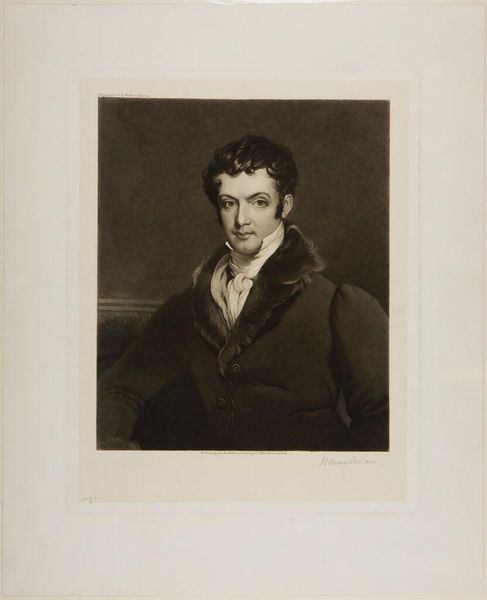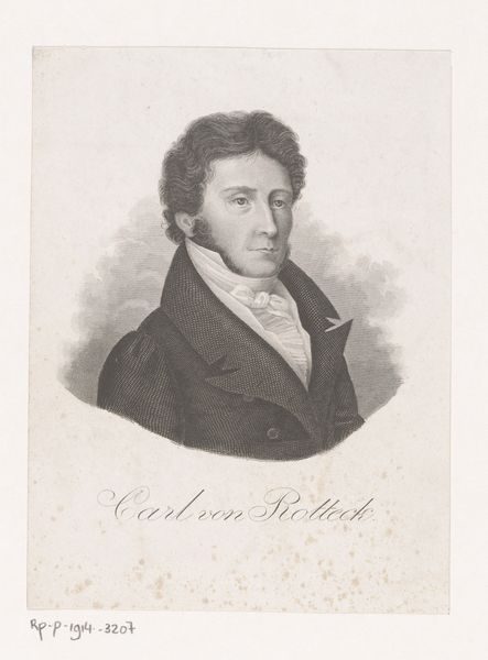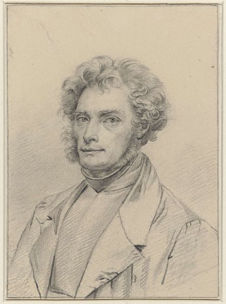 Curator: Up next, we have a self-portrait rendered in charcoal by Woutherus Mol. Scholars place it somewhere between 1810 and 1820. What leaps out at you, editor? Editor: What a melancholic gaze! There’s this almost pleading quality in his eyes. A very soft portrait, softened even more by the monochromatic scheme. But something feels a little unsettled here. Curator: Interesting. The oval frame is traditional for portraits of this era, right? But notice how his head almost bursts from it? The Romantic period often played with inner versus outer states. That curly hair, for example, it almost feels like the chaotic emotions trying to break free of the formal setting. Editor: Right! Think about the symbolic weight of ovals. They represent totality, closure, often tied to spiritual completeness. Yet, here it feels restrictive. And I'm drawn to the unbuttoned jacket – is it sloppiness? Or is he deliberately disrupting social formality to expose his true self? The Romantics often equated nature with truth... maybe a touch too revealing for some, back then? Curator: Perhaps. He seems very earnest to me. The subtle shading around his eyes, the set of his mouth... It's all about this raw, introspective honesty. Also, I think that this type of representation –that artistic leaning toward raw emotional exposure, represents a larger collective introspection within Dutch culture at that moment. Editor: Good point! And the almost vulnerable positioning of the neck... classically a site of power, of dominance, deliberately revealed here. It’s a moment of surrender. Beautiful, really, but makes you want to ask: What compelled Mol to create this intimate—vulnerable—image? Curator: Self-reflection is a strange beast. Maybe he sought to know himself better, or maybe, like many artists, he was attempting to leave a mark, a shadow of himself. Editor: Well, whatever the impetus, the effect is lasting. An almost shy portrait radiating psychological drama. I see the artist, but I also see, suddenly, so much of myself in those eyes, as well. Curator: Indeed. A compelling visual echo, reaching us across the ages. A testament to the quiet, enduring power of introspection, I think.