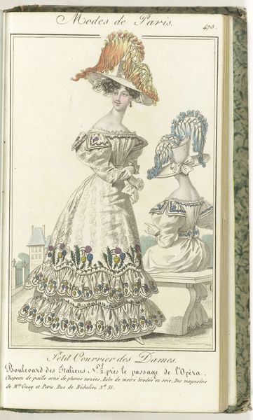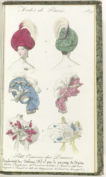 Curator: This is "Plate I from Cabinet des Modes," dating from 1786 and created by A.B. Duhamel. It is currently located in the Minneapolis Institute of Art and realized using etching, ink, and drawing on paper. It seems like it could have been a print used for the purposes of circulation? Editor: Utterly frivolous! But in a delightful way. All those hats with their plumes and frills... it feels very "let them eat cake," though undeniably stylish. Curator: These prints were made specifically for those who *were* eating cake! Or at least aspiring to. It highlights the labor involved in creating these objects of desire, with emphasis on specialized skills within the print and fashion industries, such as the engraver, printer, and *modiste*. Editor: Absolutely, a window into the material culture of the late 18th century, and particularly the lives of women within that system. These weren't just hats; they were potent signifiers of social status, carefully constructed identities broadcasting wealth and refinement. One also wonders about those women who couldn't afford these hats, but worked to make them... Curator: A sharp and astute observation. The detailed etchings, the choice of ink... It also serves as a document showcasing how aesthetic trends are visualized and distributed to those crafting or looking for such status. A vital component in both the manufacture and promotion of these designs! It served a practical purpose that transcended the whims of personal style. Editor: And what about the gazes of these women? Three out of the four sets of eyes stare right back at us, while all display their best features with an air of confidence that feels surprisingly bold. This might suggest these images aimed to promote autonomy of expression through personal fashion? Curator: An interesting question. We must note that this drawing also speaks of social norms. Etching wasn't accessible to many women and there were constraints within the guild system that women had to work against to enter these spaces. Editor: Fascinating! It appears we are seeing simultaneously a record of the gilded lifestyle of a select class, alongside evidence of the complex negotiations inherent for women working within those spheres. Thank you. Curator: Indeed, it seems there’s an ongoing negotiation between individual agency and established structure within fashion's own image economy, that carries onto today.