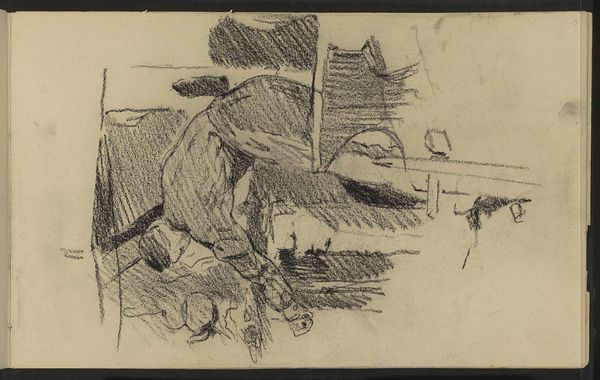 Editor: This is "Man, mogelijk zittend aan een schrijftafel," a graphite drawing by George Hendrik Breitner from 1887, found here at the Rijksmuseum. It's a sketch, really, quick and kind of blurry. It makes me think of capturing a fleeting moment, like a glimpse of someone at work. What do you see in this piece? Curator: Immediately, the emphasis lies in the application of line. Observe the varying pressure, the rapid, almost frenetic quality of the marks. Notice how the artist builds form not through contour, but through accumulation and direction of these lines. The hatching, particularly on the figure’s form, suggests a volume and weight. Editor: So, it's more about the process and technique than the subject itself? Curator: Precisely. Disregard the ostensible subject matter, a man at a writing table; consider instead the interplay of light and shadow generated by Breitner's mark-making. What structural relationships emerge from these formal decisions? Do you notice a visual tension arising from the asymmetry of the composition? Editor: I see that now – how the darker shading seems to pull the image downward. And the man's form kind of emerges from the chaos of the lines. Curator: Consider the inherent qualities of graphite as a medium. How does its texture, its capacity for nuanced tonal variation, inform our experience of the image? Editor: It seems almost raw, like we're seeing directly into the artist's process of thinking. Curator: A valid point. Perhaps the subject matter is secondary to Breitner’s investigation into the potentials of graphite, his exploration of the semiotic capacity of line itself. Editor: It’s like the sketch is about sketching! Curator: Exactly. The drawing emphasizes the core values of how the marks can build both subject and composition. Editor: I see it so differently now, it's less about the man and more about the artistic experiment on paper.