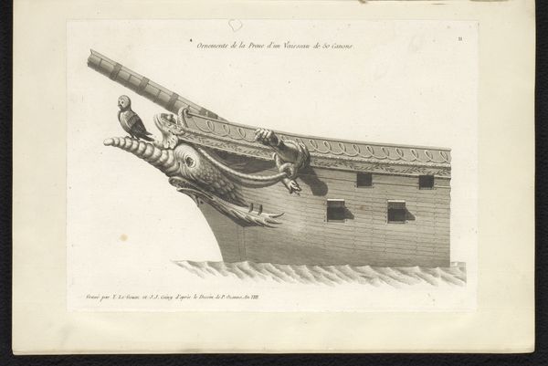 Joseph Coiny created this print of the bow and figurehead of a 50-cannon sailing ship sometime before his death in 1829. At this time France, like other European powers, relied on naval dominance for trade, colonization, and warfare. The ship's bow embodies power and prestige. Note the cannon, a symbol of military might, protruding above the ornate figurehead. This sculpture, featuring classical figures and an avian form, speaks to the cultural values and artistic traditions of the time. But, it also speaks to how people from different classes and countries became part of this cultural and economic dominance through forced labor and war. As you consider Coiny's print, think about the complex histories it represents. How do images of maritime power shape our understanding of exploration, conflict, and cultural exchange? This print, while seemingly a straightforward depiction, invites us to reflect on the deeper narratives of ambition and exploitation woven into the age of sail.