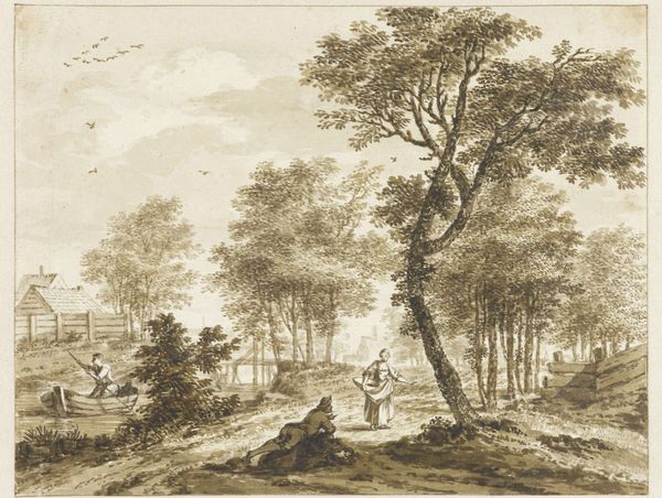 Editor: Claude Lorrain’s 1654 oil painting, "Apollo Guarding the Herds of Admetus," seems steeped in a tranquil melancholy. There’s a golden light that almost feels like a memory. What draws you into this scene? Curator: The whole thing is a gentle paradox, isn’t it? Apollo, the god of light and music, reduced to shepherding! It whispers of exile, of divinity touched by earthly limitations. The baroque drama is subdued here; it's a landscape painted with a mythological wink, like a celestial body slumming it in the countryside. I imagine Lorrain chuckling as he painted this. What do you make of the light, playing across the leaves and water? Editor: It feels like the whole scene is bathed in nostalgia, as if time itself is softening the edges of reality. I hadn’t considered the irony of Apollo’s situation. Does the setting contribute to this feeling? Curator: Absolutely. Lorrain wasn’t just painting a backdrop; he was building a stage for the myth. Those classical ruins hint at a grander, perhaps lost, age. The serenity is deceptive – underneath, you sense the weight of history, the echoes of stories. Is it melancholic, or simply reflective, do you think? It could be just that the cows don't appreciate his virtuosity, and he misses his old haunts! Editor: I think reflective suits it better now. It's not just sadness, but a thoughtful acceptance. Curator: Indeed, like a muted symphony of light and shadow, myth and reality. Makes you wonder what kind of music Apollo’s playing for those cows. Perhaps a mournful ode, or a hopeful pastoral tune… Editor: I’ll never look at a landscape the same way again. Thanks, that was great!