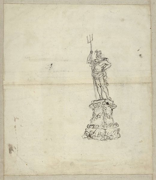 This anonymous sketch depicts a fountain in graphite on paper. The architectural design suggests a classical influence, evident in the statue atop and the dolphin motifs, reminiscent of Renaissance Italy. Fountains in this era served as prominent displays of wealth and civic pride. Often commissioned by the ruling elite, they transformed public spaces, reinforcing social hierarchies. The visual codes employed, such as the classical figure, asserted cultural authority and connected the present to a glorious past. The presence of dolphins is no accident; their significance stretches back to ancient Greece, embodying guidance and protection. Water itself, channeled through elaborate systems, became a symbol of control over nature, mirroring the era's broader ambition to master the environment. Understanding art requires delving into social history. By examining patronage records, architectural treatises, and the broader cultural context, we can interpret the meanings embedded in this sketch and its potential function in shaping public life. Art isn’t made in a vacuum.