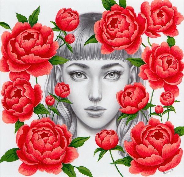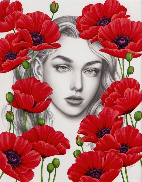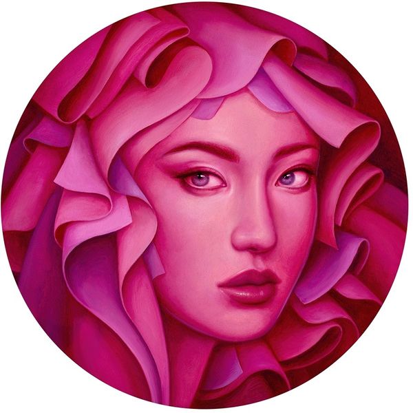 Editor: We’re looking at Allison Reimold’s oil painting, "Eve and the Snake." I find the color palette really striking – these near-monochrome pinks and reds set against that orange backdrop. It's definitely unnerving. What do you make of the way Reimold has rendered the materials here? Curator: For me, it’s all about how Reimold manipulates the oil paint itself. The slick, almost airbrushed finish she achieves, particularly on the figure’s skin, speaks volumes. It reflects a culture obsessed with flawless surfaces, readily apparent in advertising. Notice the sharp contrast between the smoothness of the skin and the slightly more textured rendering of the poppies. It draws attention to artifice. Editor: Right, and that extends to the snake itself. It almost looks like a bizarre piece of jewelry, a commodity almost. The whole image is incredibly constructed. Curator: Precisely! Consider the labor involved in achieving such a refined surface. Hours of meticulous work are dedicated to creating something that ultimately references artificiality. Furthermore, what does it mean to portray Eve, a traditionally loaded subject, through this hyper-stylized lens? Editor: So, by examining the artist’s process and materials, we can see how the artwork reflects our own consumer culture. Curator: Absolutely. Reimold utilizes the tradition of oil painting, historically associated with wealth and status, to critique those very values. The means of production are central to its meaning. Editor: I hadn’t considered that link between the historical context of oil painting and this very modern portrayal. Curator: Looking at the use of materials forces us to reconsider what we define as beauty and truth, no? Editor: Definitely! It changes how I'll view the material choices of other paintings from now on.