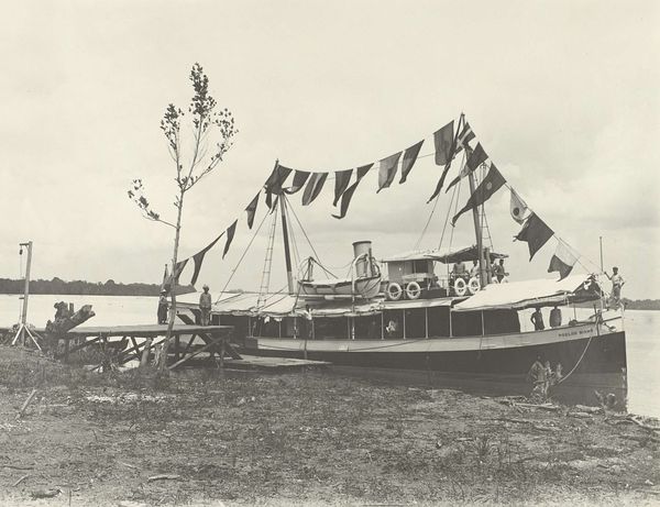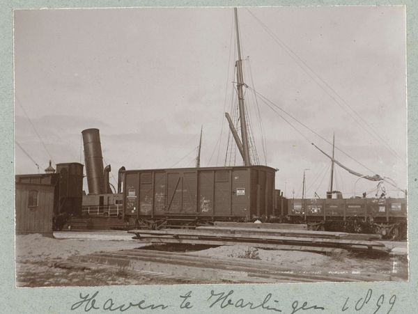 Curator: Right now we’re looking at an intriguing photographic print from the early 1900s, sometime between 1903 and 1907. It’s titled “Schepen aan de kade,” which translates to “Ships at the Quay.” Editor: It’s ghostly, almost. Like peering through a smoky lens at a time long gone. I immediately notice the stark contrast, the near absence of color just focuses my eye on the ships themselves. Curator: Precisely! It’s a study in monochrome. The texture almost feels tactile. Thinking about what kind of process yielded the soft tonal gradations – this wasn’t mass-produced, disposable imagery. Editor: Oh, certainly not. And look at those railway tracks leading to the ships – or maybe from. The scale of them makes me wonder about all the workers and their labor connecting land and sea in that period. The very structure of work at the port. Curator: You've honed in on a key point; this photographer is acutely aware of infrastructure and how people exist in the modernizing world. But there’s a beauty beyond the nuts and bolts, wouldn’t you say? The mast reaching skyward, the distant bird...almost romantic despite the industrial scene. Editor: Romantic maybe, but I keep returning to those docks – what the image leaves unsaid, it speaks louder than any puff of smoke. What did the artist or photographer mean to emphasize? The photo has that social aspect that has the need of some type of work on that specific area for those specific materials to arrive Curator: The framing emphasizes a bustling intersection, as they appear as monumental. There's this almost elegiac quality that makes me feel I'm remembering something instead of merely viewing history, you know? A subtle critique, perhaps? Or pure nostalgia? Editor: It is making me consider the sheer volume of cargo that went in and out by sea. This wasn't simply the movement of things but the shifting balance of economic power as they grew bigger and larger during the historical time and economical grow, how they shaped the city, changed lives. Curator: Photography has a remarkable capability of letting viewers reflect in ways perhaps a painted version of the same scene wouldn't necessarily offer. This photographer captured far more than simply ships at a dock. Editor: It pushes you to look past the ships as individual forms and look into the people whose livelihoods depended upon its ports to develop the trade network. Thinking in terms of material impact is key.