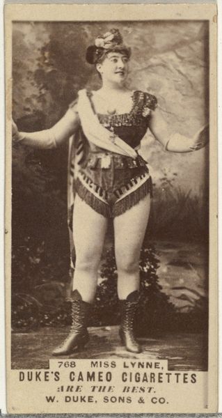 Editor: This is a photographic print from the 1880s by W. Duke, Sons & Co., titled "Lady Alphonsine, from the Actors and Actresses series." The woman's outfit strikes me as a very curious choice. What visual elements stand out to you? Curator: The image, though appearing straightforwardly representational, hinges on strategic deployment of semiotic devices. The chromatic range is limited to sepia tones, thereby imposing a historical register. This constriction of color directs visual attention to textures: the feathery plume, the patterned weave of the basket, the contrasting smooth skin against fabric. What does the superimposition of Lady Alphonsine over the advertisement do to the structural meaning? Editor: It seems the photograph attempts to imbue Lady Alphonsine with the cigarette brand, subtly intertwining their image with ideas of luxury. Curator: Precisely. Duke's decision to frame Lady Alphonsine in the same visual space as the brand implicitly aligns the cultural capital associated with female performers with the consumable good of cigarettes. The formal relationship posits a system of signification beyond the immediately visible, where consumption itself takes on performative dimensions. Would you not agree? Editor: That is a fascinating point! Thinking about it as an integration of commerce with performance... the lines are very blurry. This helps me view historical promotional material through new lenses, too. Curator: Indeed, consider it a lesson in how seemingly benign images can be parsed to unveil layers of structurally reinforced ideologies. The artist leverages the components of texture, subject placement, and medium itself, revealing an intersection of performance, promotion and identity. Editor: Thanks! I appreciate this focused analysis - I'll be sure to look closely at the composition and textural aspects when viewing images from this era going forward.