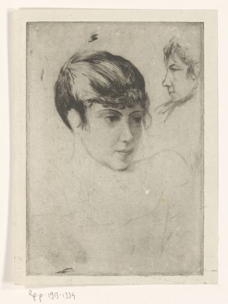 Editor: Here we have Philip Zilcken’s "Gezicht van een jonge vrouw," a pencil drawing on toned paper created sometime between 1890 and 1930. It's a rather simple portrait, almost a sketch. What can you tell me about this piece? Curator: What strikes me immediately is how the seemingly straightforward portrayal of this young woman masks a potential dialogue about representation itself. The use of pencil, the ‘unfinished’ quality… these choices can be read as resisting the idealized images of women so prevalent during that period. Consider how mass media and traditional art often contribute to a very narrow and, frankly, damaging view of womanhood. Editor: So you’re suggesting the artist is making a conscious effort to avoid idealization? Curator: Precisely! The sketch-like quality undermines a polished, often unrealistic standard of beauty. Also, who was Zilcken? Was he part of an artistic or social circle critiquing societal norms? Perhaps the choice to portray an ‘everyday’ woman, rather than a figure of status, is also significant, decentering traditional hierarchies. Editor: That's a good point. I hadn't really considered that aspect of it. The medium and style themselves become part of the statement. Curator: Absolutely! And, it prompts the question, does this subversion truly impact viewers? To what degree does this quiet act of resistance actually empower either the subject or the audience viewing the drawing? Does it really allow us to see differently? Or does the artwork actually just maintain established social orders and class structures? Editor: Those are important questions to think about. I never considered the art's message extending to its potential impact on women in society. Curator: These drawings were part of a growing shift, though, of modern artists representing women of the every day, instead of highly stylized and often overtly sexual paintings from the era. And now, having looked more closely at the tones and the subject’s attire, how have your initial impressions evolved? Editor: Now I appreciate the nuanced choices, considering what the image communicates in its historical context and if its purpose still matters today.