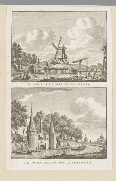 Curator: This engraving, dating from around 1786-1792, presents us with two views of Purmerend's city gates, the Purmerpoort and the Beemsterpoort. The artist is Carel Frederik Bendorp. Editor: There's such a striking simplicity. The meticulous line work really focuses my attention on the textures of the buildings and the way the light hits the water. You can almost feel the breeze off the canal. Curator: Exactly. Bendorp was documenting the civic architecture, producing these prints to disseminate images of recognizable local landmarks for public consumption, shaping a sense of local identity and civic pride. Editor: That connection to the locale is so strong. Engravings like this weren't just art objects; they were products made accessible. It’s interesting how printmaking democratizes imagery. We see the means of production influencing accessibility. Curator: Very true. Consider the impact this had on how Purmerend presented itself. Prints like these were essentially marketing the town, controlling and framing how the public at large perceived it. The images broadcast Purmerend's self-image, as a center of trade and culture, within the Netherlands. Editor: I see how it served the civic order. The uniformity achieved through engraving, these repetitive lines, speaks to a broader mechanized approach, and allowed the views to circulate far beyond paintings. The details and labor poured into those minute lines…the scale of it! Curator: Indeed, they are far removed from, say, grand oil paintings of the same era and that shifts the narrative of access and public consumption substantially. And engravings also played a vital role in cartography, urban planning, and even in circulating political propaganda. These humble-seeming prints had a grand function in society. Editor: This piece made me really consider the social and economic implications inherent to the medium itself, as much as the subject of the gates, the image is such an interesting record of 18th century labor and commerce. Curator: Looking closely helps me recognize that this isn't merely an aesthetic rendering. Bendorp and his prints played an active role in defining and distributing Purmerend's image to its public. Editor: I agree, analyzing it through its physical presence allows me to really focus on its legacy.