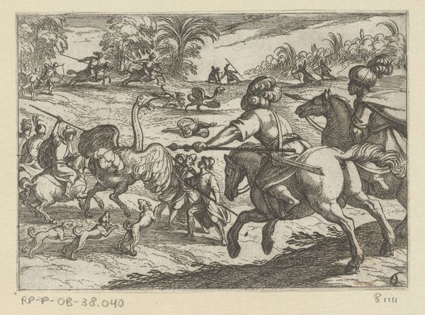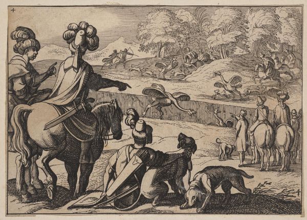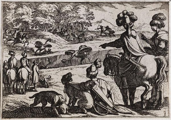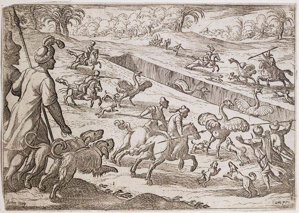 Antonio Tempesta created this print titled ‘Ostrich Hunt’ sometime between 1575 and 1630. During the late 16th and early 17th centuries, there was an increased fascination with the natural world, fueled by voyages of discovery and the rise of scientific inquiry. In this context, Tempesta's print does more than just depict a hunt; it provides insight into the early modern European worldview. The hunters are depicted in a classical style, reminiscent of Roman attire, while the exotic ostriches are thrust into this European landscape. This juxtaposition highlights the dynamic between the known and the unknown, the civilized and the wild. The hunt, as a demonstration of human control over nature, reflects the era's emerging colonial attitudes and the desire to categorize and dominate the natural world. What does it mean to chase and capture the unfamiliar? How do our desires shape our perceptions? 'Ostrich Hunt' encourages us to reflect on how we engage with the world and each other.