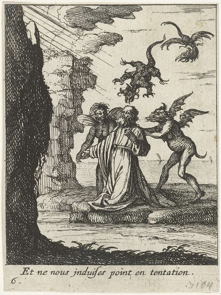 Curator: Today we’re looking at "Engel neemt kind gekleed als pelgrim bij de hand" or "Angel Leading a Child Dressed as a Pilgrim," a print dating from 1590 to 1624, currently held in the Rijksmuseum. Editor: It's small, and finely worked, this little engraving, isn’t it? There's a real sense of contrast; darkness against light. I'm immediately drawn to the material elements: the heavy stone versus the soft clothes of the figures, and how the engraver achieved this difference. Curator: Yes, that contrast is so central. Considering the broader context, pilgrimage at the time had profound spiritual and political resonance. The child pilgrim can be seen as a vulnerable soul guided by a divine presence, a journey mirroring broader social anxieties of the period concerning religious persecution and displacement. Editor: Right, the figure’s journey. Is there something about this print relating back to production? How was this figure supported? Whose labour produced the pilgrimage clothing, staff and bag, what materials, from which lands and the production processes in workshops needed for Bolswert’s work. The angel, likewise: are we really able to look at such material, as the product and consumption of ideas which are realised, but also obscured. Curator: Definitely. This interplay reflects a growing humanist perspective – situating the individual, albeit a child, within a structured cosmos guided by faith. There is the question to whom does this refer: could it stand for Protestant flight from the Netherlands? Are the clothing designs drawn from local designs and styles of clothing, which might indicate some deeper cultural meaning that touches identity? Editor: Interesting, and it reminds me to refocus attention on its making as an object. Take the cross-hatching: an engraving technique, to translate and create light, to add depth; it makes us think of artisanal labour and then the mechanical reproduction through printing. I'm captivated by this interplay of the physical and the ethereal. Curator: Seeing the journey both as a literal path and a metaphorical journey of faith enriches our understanding, the work reflecting shifts in cultural identities during the Baroque era, in their production, expression, and representation. Editor: Exactly. The journey involves more than one form. It prompts reflections on how the making of art contributes to society and the individual experience. Thank you.