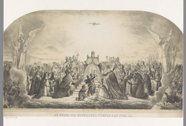 Curator: Welcome! We're looking at "The Improvement of Morals," an engraving and etching produced around 1786 by Daniel Nikolaus Chodowiecki, currently residing at the Art Institute of Chicago. Editor: It strikes me as didactic, yet strangely…airy. The light tones, almost like a washed-out dream, contrast oddly with what I assume is supposed to be a serious moral lesson. The composition feels quite stage-like, framed almost. Curator: Precisely! Note the proscenium arch, embellished with putti and foliage. Chodowiecki uses this pictorial framework to present a social commentary in a highly structured manner. The linearity and balanced forms align with Neoclassical aesthetics. Editor: But look closer. While the stage presents "correct" morals, the people on the periphery engage in anything but! Is that a balloon escaping with a passenger in the background? Are those onlookers mimicking the "proper" behaviour as performance or truly taking heed? What hierarchies are being performed here, in what could also be interpreted as a theater? Curator: That very tension between ideal and reality is key. The grid of images at center functions almost like a powerpoint presentation for moral reform. Notice the clean lines and clarity. Editor: I can’t ignore how social class informs the whole endeavor. The 'improved morals' clearly pertain to those observing – who seems to represent diverse social strata – while those doing the instructing occupy positions of power. Is this engraving simply reinforcing those hierarchies? And what about those folks lounging in the right foreground; are they intentionally excluded from the didactic exchange or is their exclusion a sign of refusal? Curator: A valid point. We could also analyze how Chodowiecki employs the etching medium itself. The fine lines, the gradations of tone—all serve to create a sense of order and reason. It is a controlled medium, ideal for conveying such structured moralizing narratives. Editor: Control seems the operative word. A performance for who? An enforcement of what norms? An illusion in soft-toned lines on a flat sheet. Curator: Well said. I'm struck by the composition and how it creates, within itself, a series of dialogues: periphery and center, darkness and light. Chodowiecki’s vision is complex, despite its seemingly straightforward message. Editor: The artwork, initially seemingly simple, now exposes an intricate social discourse! It asks critical questions of not just late 18th century Prussian morals, but, still resonating today, poses necessary inquiry.