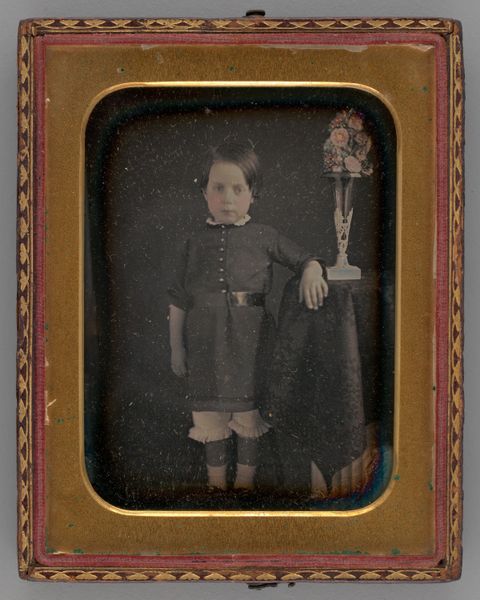 This is a photograph of Abby Frances Snow, aged two and a half, made by an anonymous artist. Note the careful composition, contained within a gilded frame. The oval format draws our eye to Abby’s face, softly lit and framed by dark curls. The rigid structure of the photograph belies its subject: a young child. Her formal pose reflects the conventions of portraiture at the time and emphasizes the sitter’s social status. The softness of her dress, patterned with subtle floral designs, contrasts with the sternness of her gaze. The contrast destabilizes our perception of childhood innocence, highlighting the constraints of representation. The slight imperfections on the plate's surface—scratches and subtle discolorations—introduce an element of chance, disrupting any sense of idealized perfection. Consider how these formal elements—the composition, the contrast between softness and rigidity, and the imperfections—invite ongoing interpretations of identity and representation.