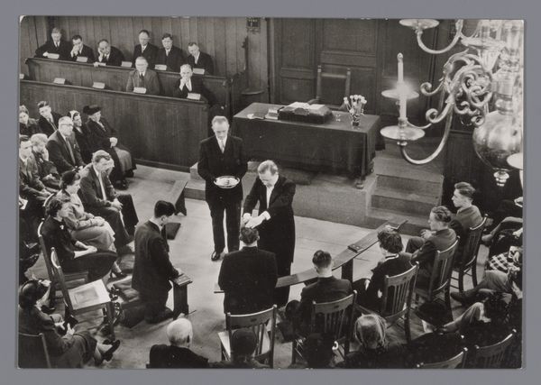 Curator: Robert Frank’s gelatin silver print, “Woman before man at desk—Filming,” created between 1941 and 1942, immediately strikes me as a carefully constructed tableau, almost theatrical in its arrangement. Editor: I feel a somber moodiness. The limited tonal range of the gelatin silver print, along with the enclosed composition, really contributes to a feeling of suspense. I immediately get this sensation that something pivotal is occurring. Curator: Precisely. Observe how the contrasting light emphasizes certain figures—note the man's head bent in deep concentration over paperwork, the woman’s erect poise—while obscuring others. This is clearly deliberate. There is a play of chiaroscuro that focuses the viewer’s eye. Editor: Contextually, it’s hard to ignore the war years in which this piece was created. Do you see it mirroring societal expectations or norms of that time, especially relating to gender and duty, during the early forties? Curator: It's a valid point. There is a narrative subtly encoded here; in addition to what may reflect expectations in a still photographer from Europe making their way into Hollywood culture, there may also be references to contemporary film making or social class issues. Yet Frank has abstracted it just enough through the use of strong verticals, tonal variations and an asymmetrical approach to his focal objects, where one could extract other aesthetic propositions, equally relevant and impactful to the photograph itself. Editor: Absolutely, I feel there are embedded symbols, in every corner of this image: The steps leading toward darkness, and away from the light. What might be hidden on that document that we can’t see. This isn't just capturing reality; it is also layering on meaning. Curator: To push this idea a bit further, note how he draws your eyes upwards and back in the composition? This creates layers and introduces some depth while leaving parts shrouded. Editor: So ultimately, this isn’t just a straightforward image of a filming process but rather an intersection of life and commentary—one frozen frame speaks volumes of both technical art and emotional artfulness. Curator: Agreed. Frank’s ability to weave together formal technique with complex undertones highlights the multilayered quality that allows his photograph to maintain its emotional intensity through formal components.